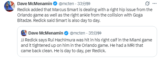 雷迪克还补充道,斯马特在对阵魔术的比赛中右髋出现问题,同时此前与比塔泽相撞导致的右脚踝伤势仍未恢复。雷迪克称斯马特同样为每日观察状态。
