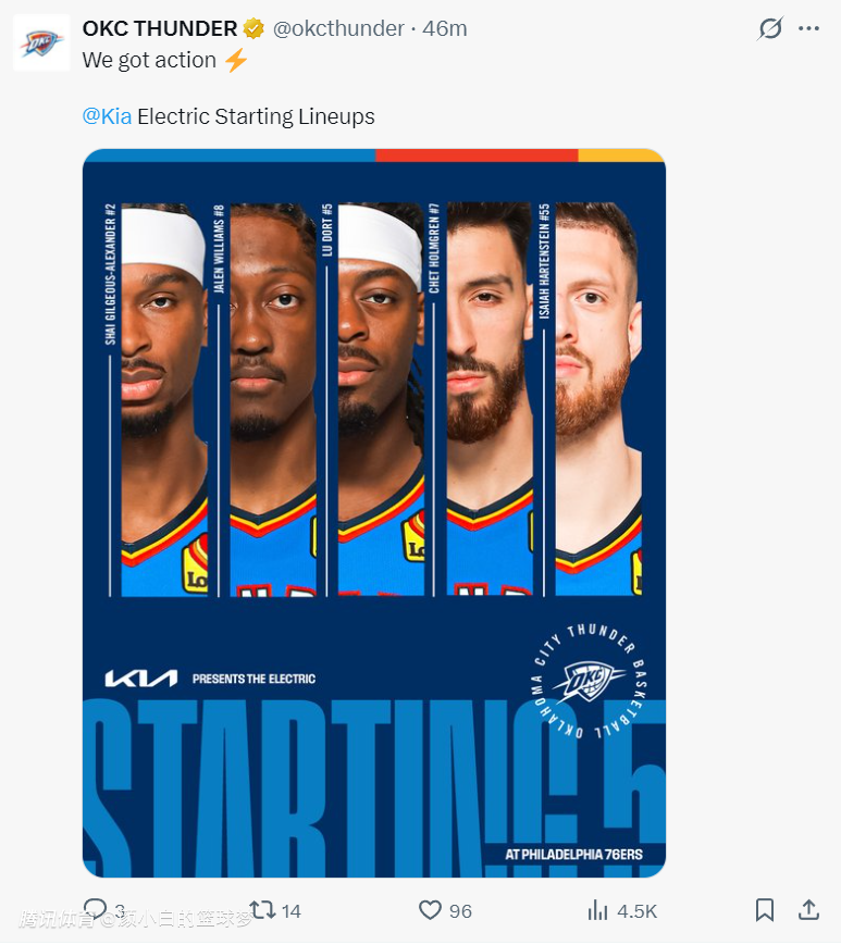 这场比赛雷霆迎来了他们久违的夺冠先发阵容:SGA、杰威、多尔特、霍姆格伦、哈腾,这套先发的攻防能力都非常恐怖。亚历山大的进攻压力就减小了很多,上一场对阵奇才SGA爆砍40分,而此役SGA首节只有8分1篮板1助攻1抢断1盖帽,杰威2分2助攻,霍姆格伦5分3盖帽2助攻,哈腾4分2篮板1助攻1抢断。