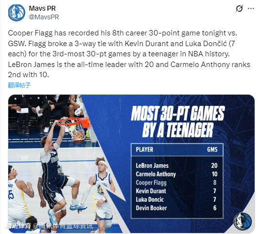 根据数据统计显示,这是弗拉格职业生涯第8次单场得分30+,他超越了杜兰特和东契奇(各7次),成为NBA青少年球员中单场30+场次历史第三人,仅次于詹姆斯(20次)和安东尼(10次)。值得一提的是,东契奇整个新秀赛季曾8次单场30+,目前弗拉格还有10场比赛的机会来完成对东契奇的超越。