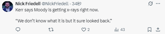 穆迪在独行侠队的X光室内接受了检查,目前他已经拄上了拐杖,行动缓慢,勇士队医塞莱布里尼一直陪在穆迪身边。波杰姆斯基表示,勇士队内更衣室氛围就跟吉米-巴特勒重伤时一模一样。
