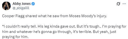 2026-03-24 14:00北京时间3月24日,NBA常规赛继续进行,独行侠队经过加时苦战,131-137不敌勇士队。本场比赛最后时刻,勇士队球员穆迪遭遇重伤。赛后,独行侠球员库珀-弗拉格(此役砍下32分)接受采访,谈到了自己对于穆迪受伤一事的看法。