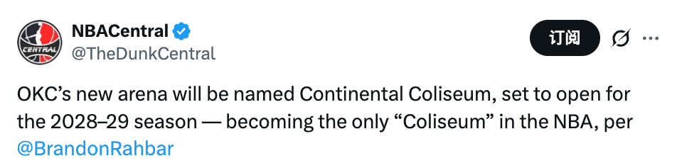 稍早前,雷霆队与大陆资源公司联合宣布,就位于俄克拉荷马城市中心的全新现代化球馆大陆体育馆达成一份为期15年的冠名合作协议。目前球馆选址地块的拆除工作已接近尾声,施工团队即将进场启动建设。大陆体育馆计划于2028年夏末正式开放,为俄克拉荷马城的体育与娱乐事业开启新纪元。在新场馆投入使用前,雷霆队将继续在Paycom中心(原切萨皮克能源球馆)进行主场比赛。