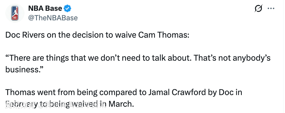 有记者问到雄鹿主帅里弗斯关于裁掉托马斯的话题,后者表示:“有些事我们没必要拿出来说,这跟其他人无关。”