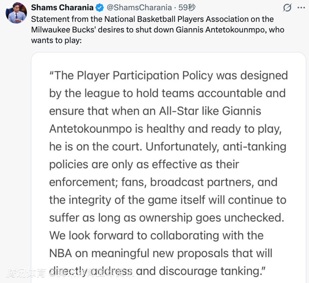 2026-03-25 02:10北京时间3月25日,据名记Shams报道,NBA球员工会就密尔沃基雄鹿队想要轮休字母哥(而字母哥本人希望出战)一事发表声明。