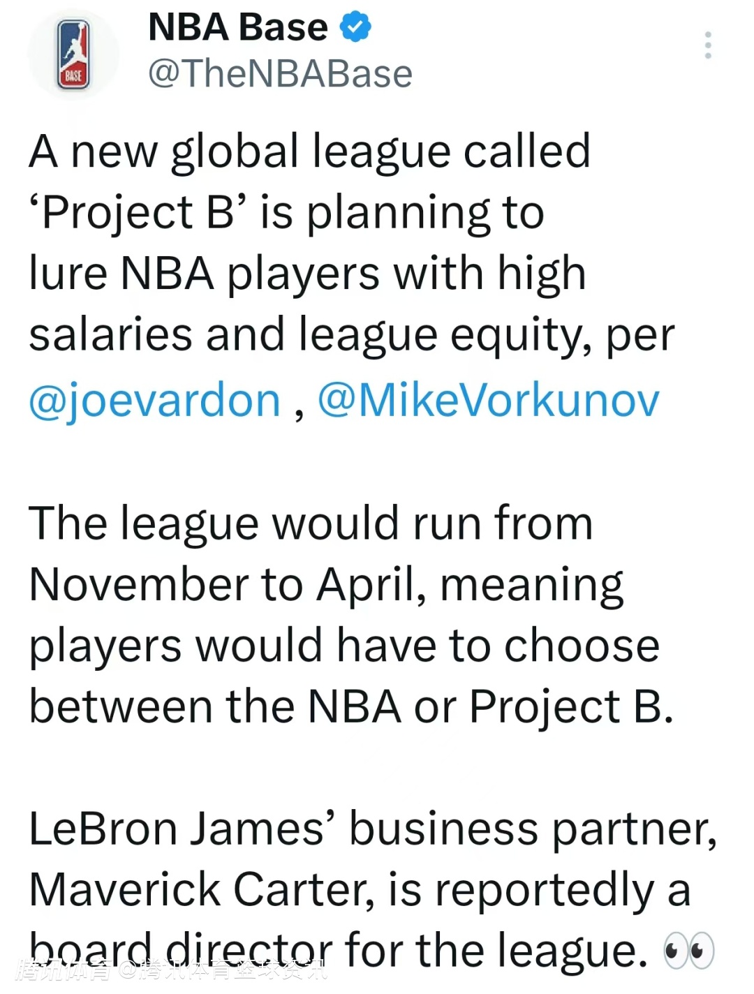 Project B同时在与NBA欧洲知名经纪人米什科-拉兹纳托维奇合作,他旗下有约基奇等众多欧洲NBA球员。今年夏天,拉兹纳托维奇曾与卡特、詹姆斯同船并被拍到,当时几人已讨论过该联赛相关事宜。