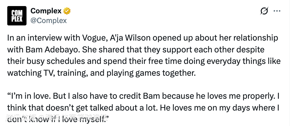 而在1月份,阿德巴约在接受采访时,也谈到了女友阿贾-威尔逊,他表示:“大家都知道我的另一半是谁。当你经历很多事情的时候,最棒的事情之一就是你能感同身受她正在经历的一切,以及你自己正在经历的一切……大多数男人会和另一半倾诉,她们要么没经历过恋爱,要么就是刚接触恋爱,并不完全理解你的感受。但能找到一个百分百理解你处境的人,真的是一种莫大的恩赐。”