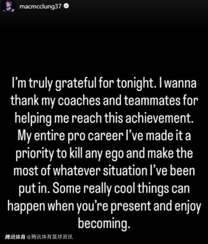 麦克朗在社媒写道:“我真的非常感激今晚。我要感谢我的教练和队友们,是他们帮助我达成了这一成就。在我的整个职业生涯中,我一直把放下自我、全力适应并把握每一种处境作为首要目标。当你专注当下、享受成长的过程时,真的会发生一些很棒的事情。”