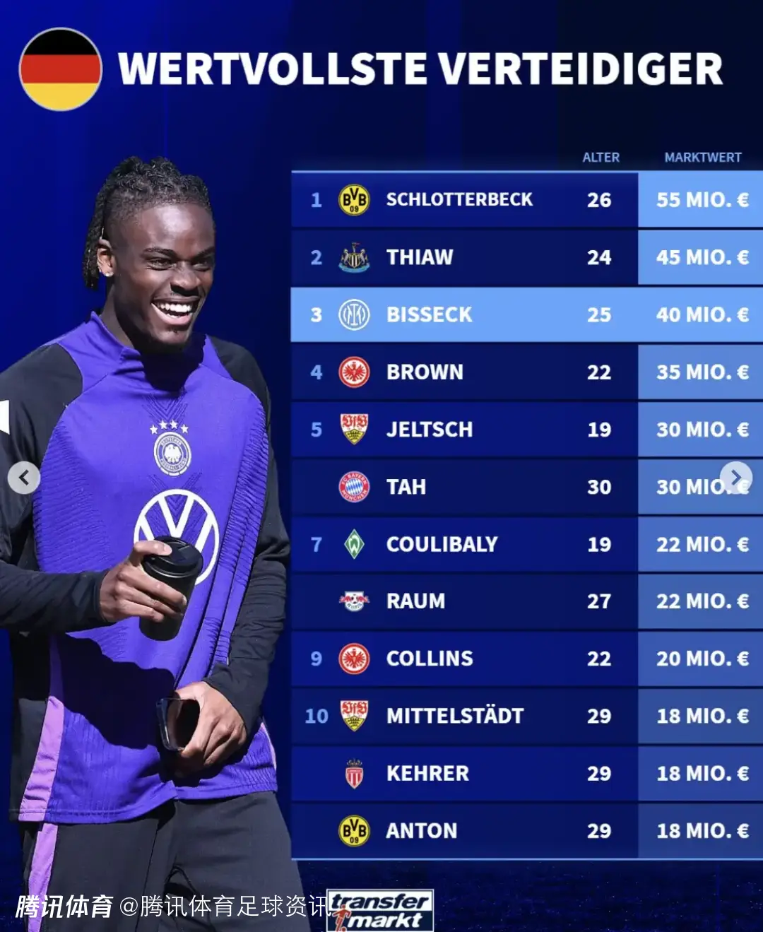 从整体榜单来看,德甲球员占据明显优势,多支球队均有球员入围前十,体现出联赛在后卫培养上的深厚底蕴。完整排名如下: