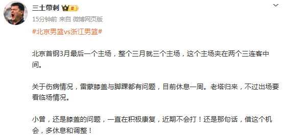 关于伤病情况,许利民表示:雷蒙膝盖与脚踝都有问题,目前休息一周。老塔归来,不过出场要看临场情况。