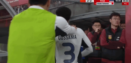 尽管比赛双方动作很大,但麦麦提江始终没有出示黄牌。在补时第7分钟,也就是最后一分钟,U23国足获得边路任意球。在禁区内争抢时,双方的4名球员互相推搡,乌萨马-添坎一拳打倒U23国足球员,双方球员发生冲突。