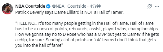 “其次,名人堂的标准理应是:数据(得分、篮板等)、胜场、季后赛履历、总冠军这些综合起来的结果。如果我们连罗斯拿MVP都不认可,却觉得利拉德能进名人堂?你懂我意思吧?”