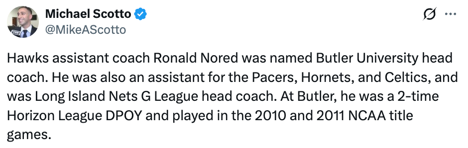 老鹰助教诺雷德被任命为巴特勒大学主帅 球员生涯曾为该校效力