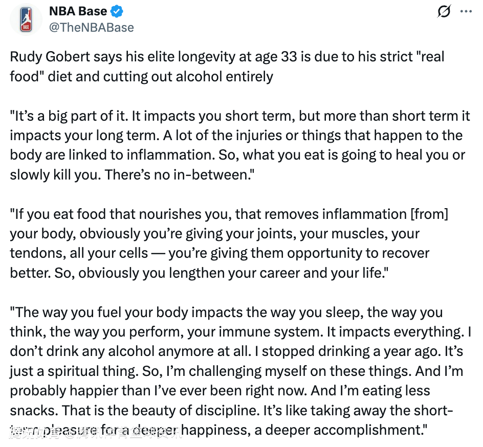 戈贝尔表示,自己在33岁仍能保持顶级竞技状态,要归功于严格的饮食习惯以及彻底戒酒:“这是很重要的一部分。它不仅影响短期状态,更会影响长期表现。身体出现的很多伤病问题都和炎症有关。所以,你吃的东西要么在治愈你,要么在慢慢摧毁你,没有中间地带。”