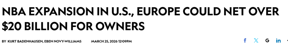 保守估算,这两项举措或将为现有NBA球队老板创造总计200亿美元的收益——其中两支美国本土球队的扩张加盟费约150亿美元,欧洲联赛加盟费约50亿美元。