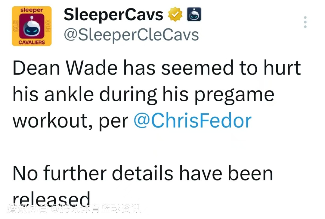 2026-03-26 06:40北京时间3月26日,NBA常规赛继续进行,骑士对阵热火。据骑士队记Chris Fedor报道,骑士球员迪恩-韦德在赛前热身时疑似扭伤脚踝。目前暂无更多细节公布。