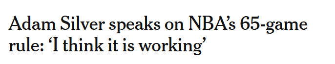 “联盟与球员工会当时一致认为,我们必须对此采取措施,最终便确定了65场规则。当然,数字也可以是68场或62场,这是谈判的结果。但总体而言,我认为它起到了作用。连同球员出场政策一起,如今关于负荷管理的讨论已经少了很多,部分原因就是球队和球员都做出了回应,大家能更多地在场上看到他们。”