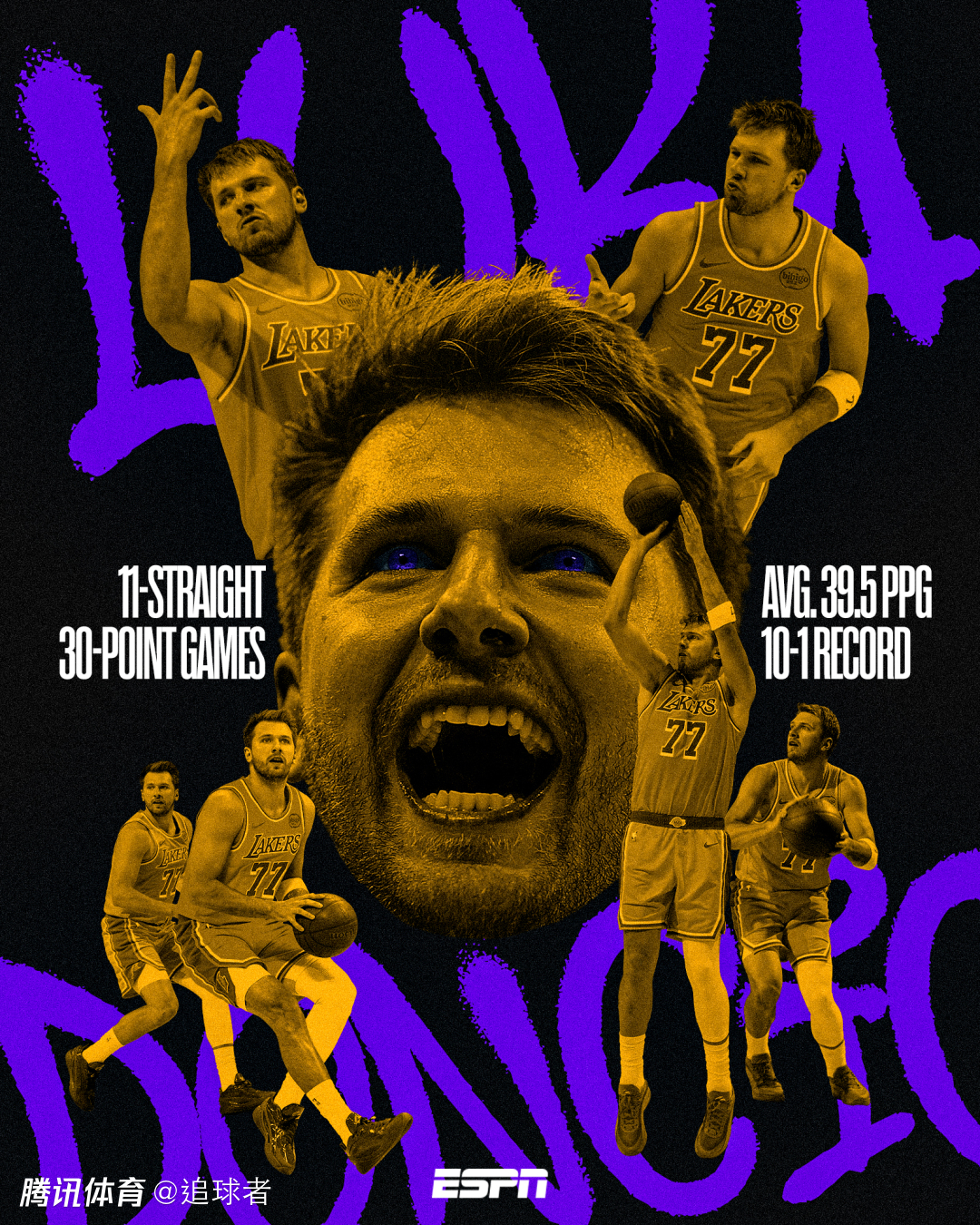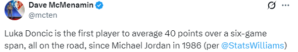 湖人以5胜1负的战绩结束六连客,期间东契奇场均轰下40.7分,自1986 年迈克尔-乔丹以来,首位在连续六场比赛中场均至少拿到40分的球员。