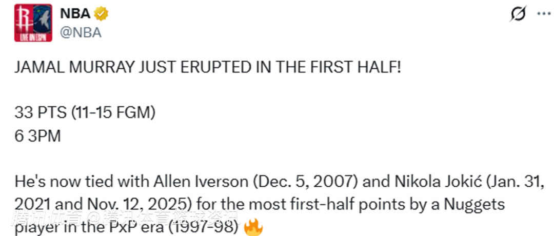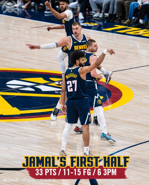 上半场战罢,穆雷首发出战19分钟,投篮15中11,三分球9中6,狂砍33分3篮板2助攻,他也是全队唯一一名在上半场得分上双的球员。他目前与艾弗森(2007年12月5日)、约基奇(2021年1月31日、2025年11月12日)并列,成为继1997-98赛季开始完整记录逐场比赛数据至今掘金队史半场得分最多的球员。