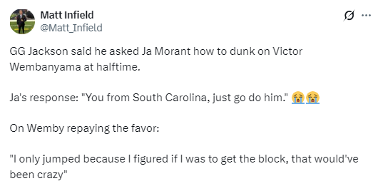 杰克逊说道:“莫兰特告诉我,你可是南卡罗来纳州出来的,直接干他就完了。”值得一提的是,莫兰特曾在比赛中隔扣过文班亚马。而在下半场比赛开始后没多久,得到了指点的杰克逊也成功隔扣文班亚马。