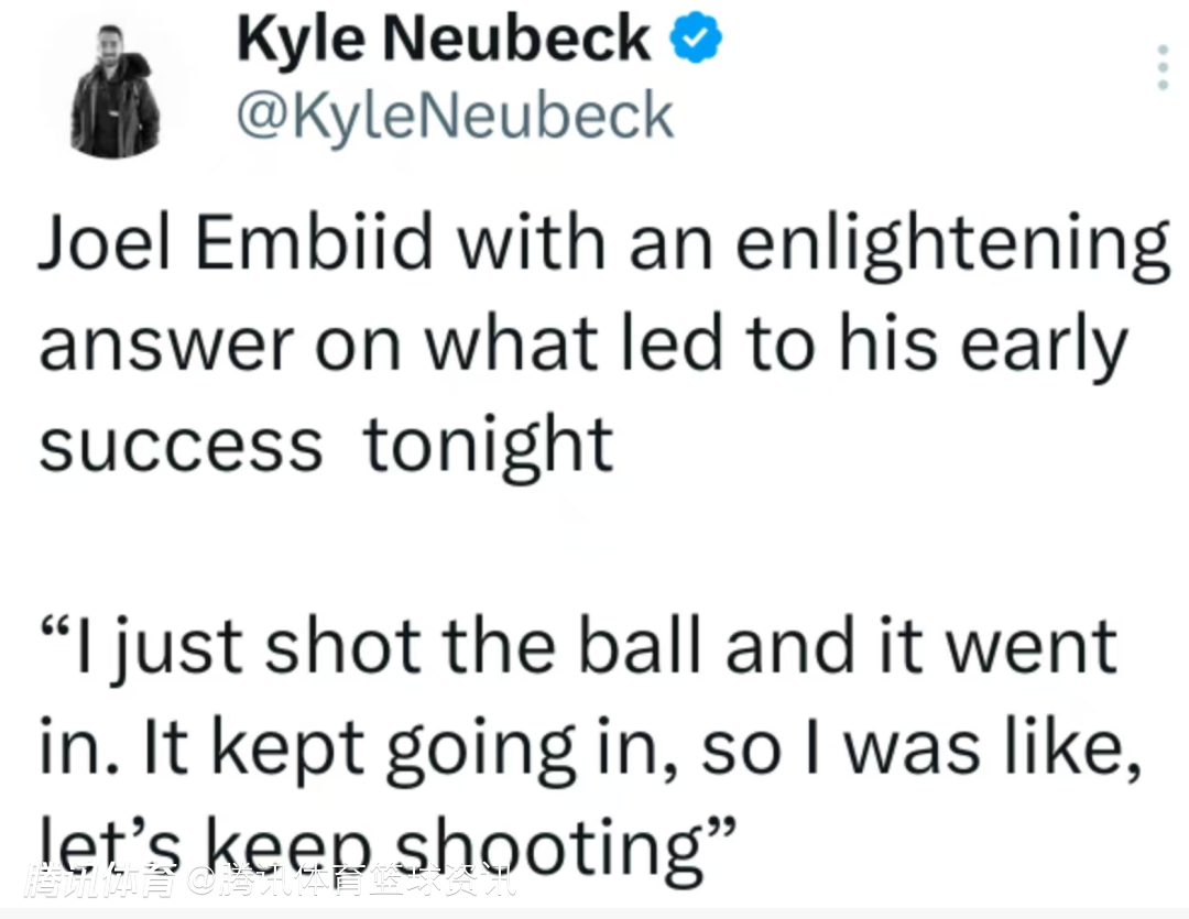 恩比德谈及自己今晚开局状态火热的原因,给出了十分直白的回答:“我就是出手投篮,然后球就进了。一直都能投进,那我就想着,继续投就完了。”