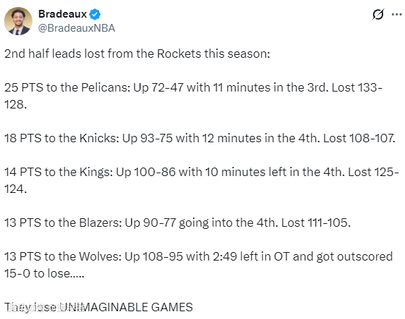 本赛季至今,火箭已经多次在下半场大比分领先的情况下被逆转;火箭媒体人Bradeaux列出火箭被逆转的情况——