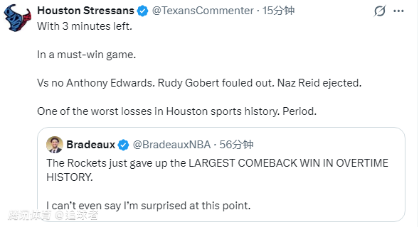火媒Houston Stressans破防狂喷火箭,发推写道:3分钟不到的时间领先13分。这是一场必须赢下的比赛。对手没有安东尼-爱德华兹。鲁迪-戈贝尔犯满离场,纳兹-里德被驱逐出场,火箭真是个笑话一般的球队,这是休斯敦体育史上最惨痛的失利,没有之一。