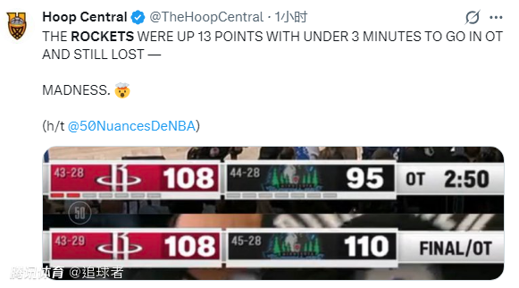 本场比赛加时赛,火箭开局13-0却被森林狼打出一波15-0完成逆转,火箭创NBA历史加时赛最大被逆转分差;火箭耻辱输球引热议。