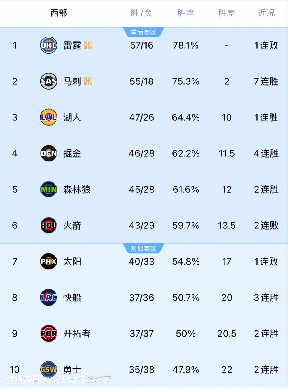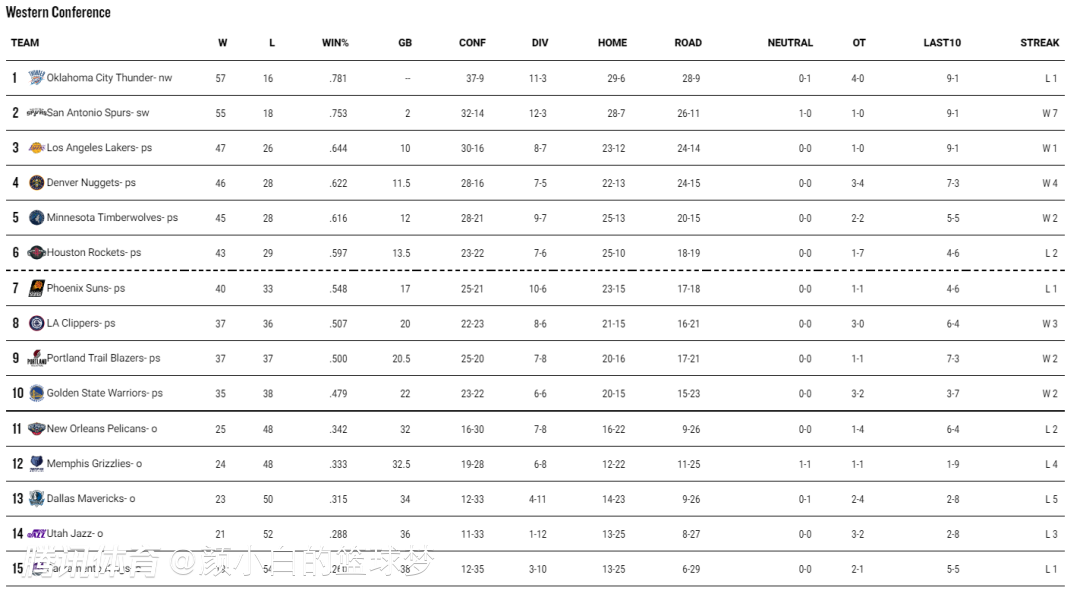 最新的排名:1-3:雷霆、马刺、湖人;(前二已经锁定季后赛)