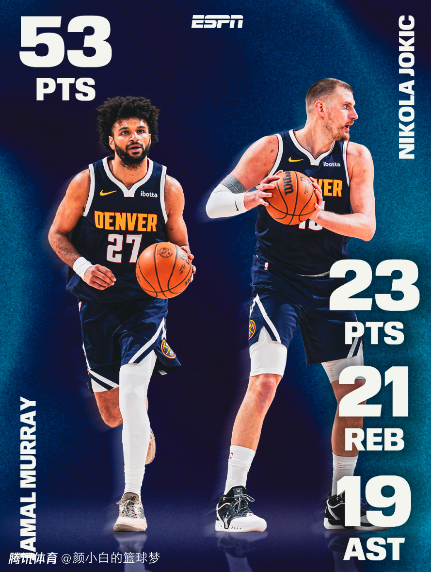 掘金的双核一同爆炸,约基奇拿到23分21篮板19助攻的超级三双,穆雷则拿到53分+9个三分球,掘金击败独行侠拿到四连胜,掘金维持了西部第四的席位。