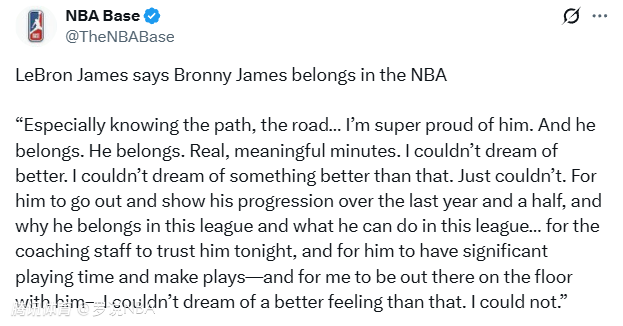 “这是真实且有意义的出场时间,没有比这更好的结果了,真的没有,”詹姆斯说道,“他走上场,我的意思是显然他……在这近一年半的时间里,他的进步有目共睹。也证明了他为什么配得上在这个联盟打球,以及他能在这个联盟做到什么。所以,教练组今晚信任他,给他大量出场时间,还让他完成了几次精彩的配合——而
