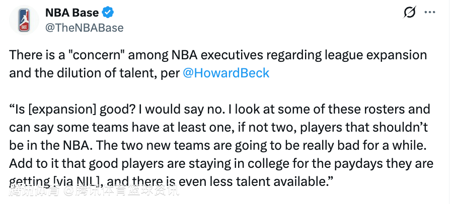 贝克透露,一支季后赛强队的高管表示:“扩军绝非好事。看看现有不少球队的名单,有些球员压根达不到NBA准入标准,却仍在联盟立足。人才被稀释已是不争的隐患,两支新军初期注定实力孱弱。再加上如今名校优质球员为拿到名校姓名形象权补贴(NIL政策红利),选择留校征战NCAA联赛,可供NBA挑选的顶尖新人资源本就愈发紧张。”