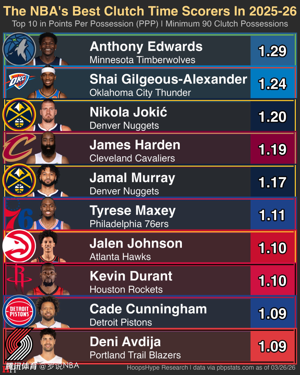 2026-03-27 16:00北京时间3月27日,在NBA的世界里,“关键时刻”往往都是检验球星成色的试金石。当比赛进入最后五分钟、分差在五分以内的刺刀见红阶段,谁能稳稳把球送进篮筐?2025-26赛季至今的最新数据(截至当地时间3月26日前)给出了答案——在至少出战90个关键回合的球员中,每回合得分效率前十的榜单藏着本赛季最冷血的杀手们。