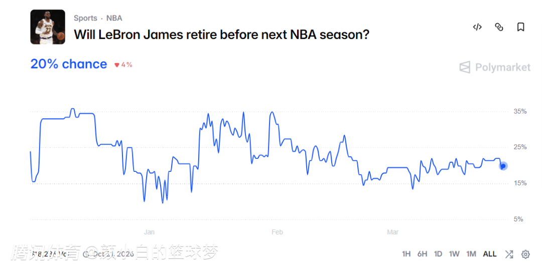 根据数据媒体Polymarket的预测,詹姆斯在本赛季打完后退役的概率只有20%。就算洛杉矶湖人队最终放弃了老詹,那么联盟其余的29队可能都会来争取他。如果勒布朗愿意接受底薪的话,不知道多少球队要踏破勒布朗的门槛。