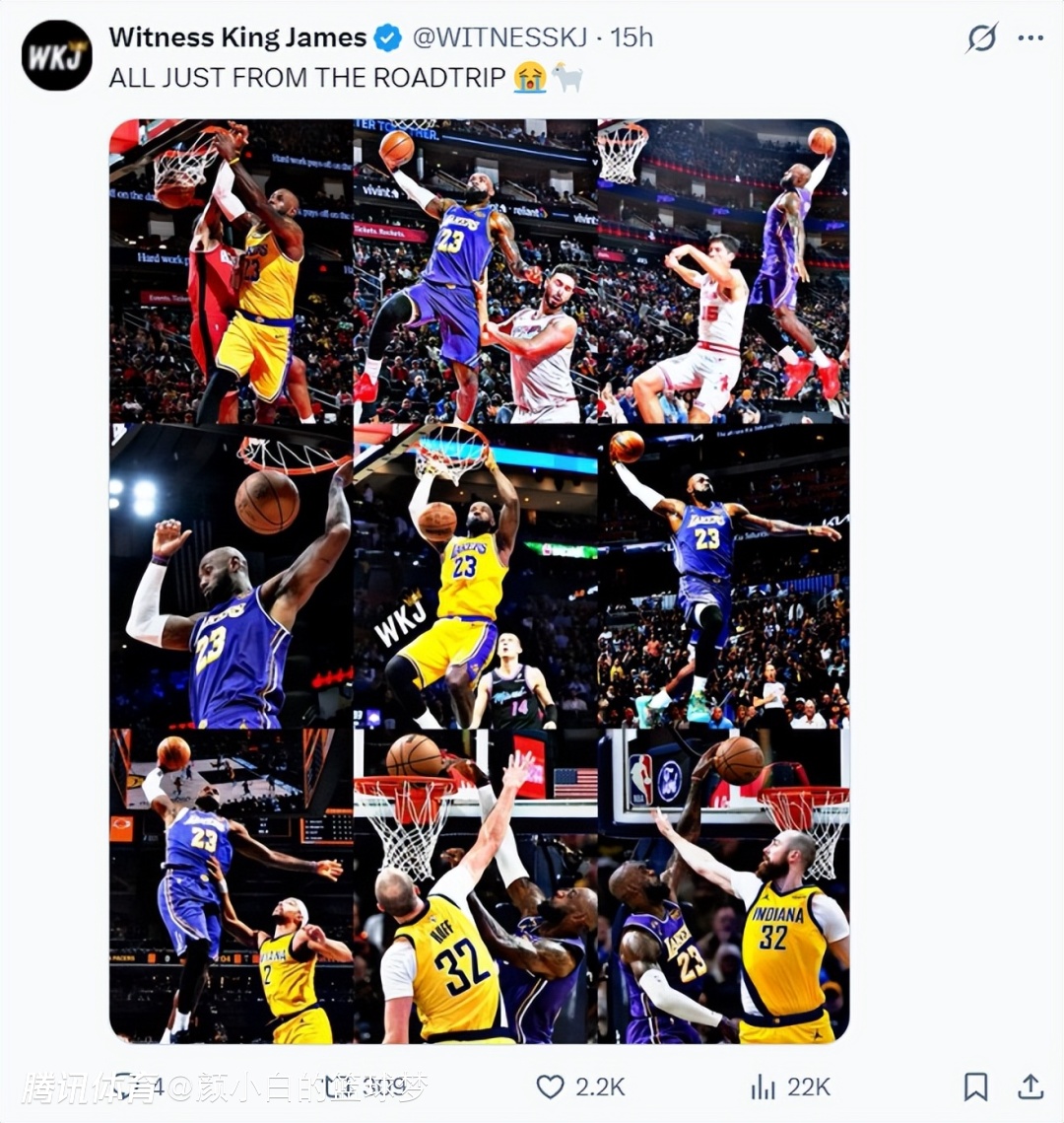 根据湖人媒体WKJ的统计,在湖人六连客(5胜1负)中,41岁的老头勒布朗合计15次暴扣,场均2.5次暴扣,他是联盟30岁以上唯一一位能完成这一数据的球员(35岁都无人能做到包括中锋)。