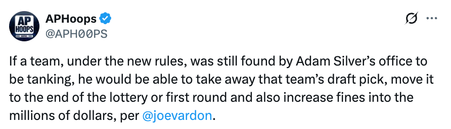 2026-03-28 00:30北京时间3月28日,据美记Joe Vardon报道,在新规下,若NBA总裁萧华认定某支球队仍在“摆烂”,他有权直接没收该队的选秀权、将其顺位调整至乐透区末尾或首轮末段,同时还可对球队处以数百万美元的高额罚款。