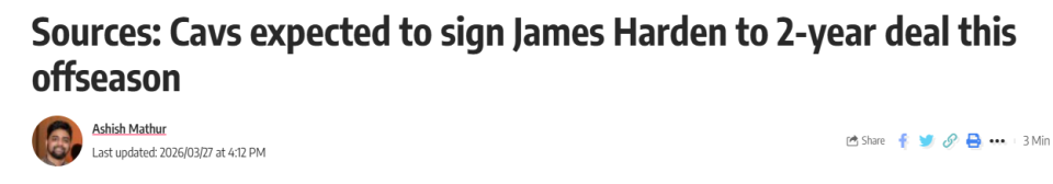 2026-03-28 05:40北京时间3月28日,据Cavaliers Nation消息人士透露,克利夫兰骑士预计将在今年休赛期与詹姆斯-哈登签下一份两年合同。