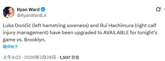 2026-03-28 06:10北京时间3月28日,NBA常规赛继续进行,湖人对阵篮网。赛前,湖人方面更新本场比赛伤情报告。东契奇(左腿筋酸痛)与八村垒(右侧小腿伤势管理)的出战状态已升级为可以出战,将能够参加今天对阵篮网的比赛。