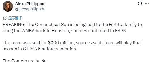 2026-03-28 06:20北京时间3月28日,据ESPN记者亚历克莎-菲利普报道,由休斯顿火箭队老板蒂尔曼-费尔蒂塔领衔的费尔蒂塔家族于周五达成协议,以3亿美元收购康涅狄格阳光队。这意味着,这支球队将在今年夏天打完在康涅狄格的最后一个赛季后,于2027赛季正式搬迁至休斯顿。