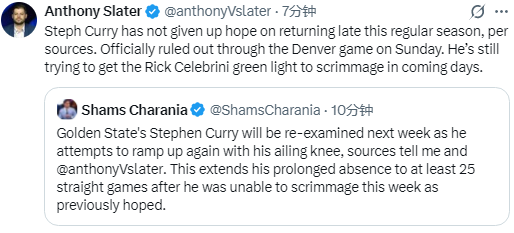随后,Anthony Slater补充报道,据消息人士称,库里并未放弃在本赛季常规赛末段复出的希望。他已被官方确定缺席周一对阵掘金的比赛。他仍在努力争取勇士队医疗主管里克-塞莱布里尼的许可,以便在未来几天内参加对抗训练。