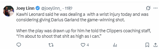 在谈到为何自己总能命中关键球时,莱昂纳德说道:“就像我说的,保持精神专注就行。我第四节手感不佳,所以就下定决心把球投出去。我今天手腕还有伤,只能咬牙坚持,整场比赛都在摸索怎样才能把球投进。”莱昂纳德还透露,他原本还考虑把绝杀球的机会交给加兰。当战术为他布置好后,他对快船教练组说道:“我准备把这球尽可能往高了投。”