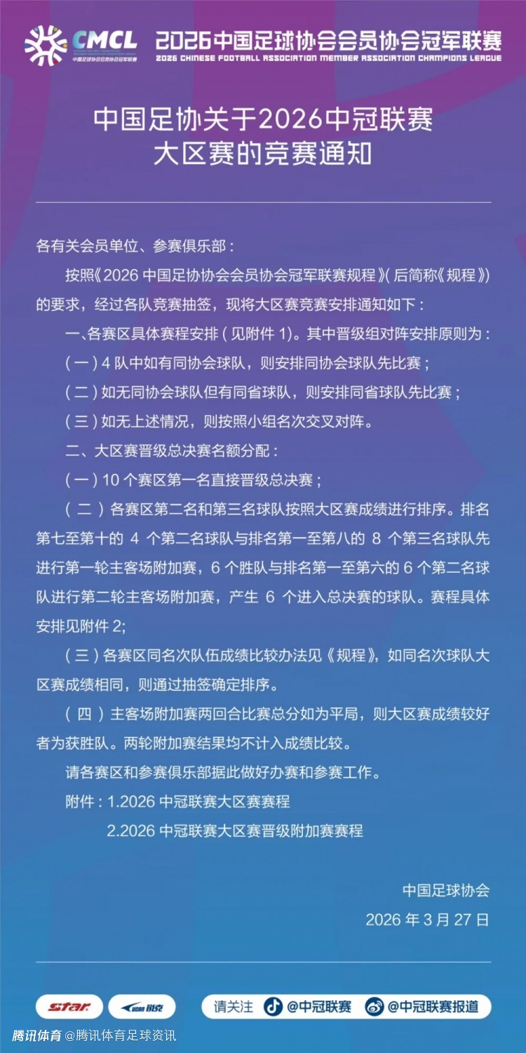 2026-03-28 10:40北京时间3月28日,中国足协官方发布了关于2026中冠联赛大区赛竞赛通知,10个赛区第一名直接晋级总决赛。