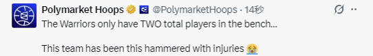 按照NBA的规定,每支球队每场比赛可以报名13人,但勇士队今日的报名名单总计只有11人。此役,勇士队内总计有7名球员缺阵,分别是梅尔顿(左膝伤病管理)、巴特勒(右膝前交叉韧带手术)、塞斯-库里(左内收肌拉伤)、斯蒂芬-库里(右髌股关节疼痛综合征)、霍福德(右比目鱼肌拉伤)、穆迪(右手腕扭伤)、波斯特(右脚伤病管理)。