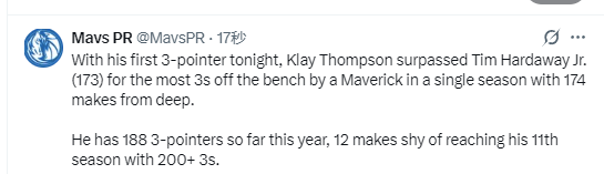 根据数据统计显示,这是克莱-汤普森本赛季作为替补所投中的第174记三分球,他超越了小哈达威(173记),成为独行侠队史单赛季替补出战命中三分最多的球员。