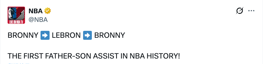 2026-03-28 11:50北京时间3月28日,NBA常规赛,湖人主场对阵篮网,第二节还剩下7分多钟的时候,詹姆斯助攻布朗尼命中三分球,完成了NBA历史首次父子连线。
