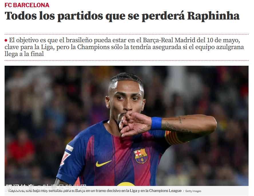 如果伤势恢复顺利,拉菲尼亚将在5月10日的西甲国家德比复出。
