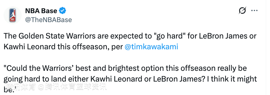 2026-03-29 00:00北京时间3月28日,据记者Tim Kawakami报道,金州勇士队预计会在今年休赛期全力追逐勒布朗-詹姆斯或莱昂纳德。