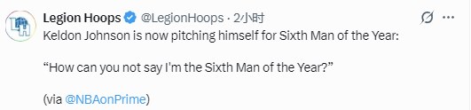 凯尔登-约翰逊说道:“说到最佳第六人,我觉得自己本赛季每一场比赛都全力以赴,只要身体允许,我就会一直保持这样的状态。我在球队的角色定位里打得效率很高,而且我们球队战绩出色。把这些点放在一起,凭什么说我不是最佳第六人?我每天都全力以赴,做好自己该做的事。队友们都认可我,教练们也认可我,数据也能证明这一点。我觉得这就足够了。”