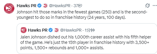 本场比赛之前,杰伦-约翰逊职业生涯已经送出995次助攻。在上半场比赛中,他已经送出了7次助攻,成功完成1000次助攻里程碑。