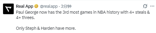 根据数据统计显示,本场比赛是乔治职业生涯第30次单场至少4抢断并投中4+三分球,成功超越布莱洛克升至历史第三位,仅次于哈登的38次和库里的33次。