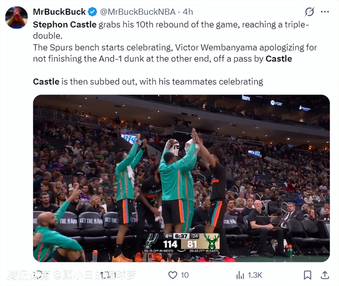 根据雄鹿现场记者的报道,在卡斯尔拼下本场第10个篮板后他达成三双,马刺队替补席起立庆祝。文班亚马还在另一端为接到卡斯尔传球未能完成2+1的暴扣而道歉。随后卡斯尔被换下,他的队友们都过来祝贺。